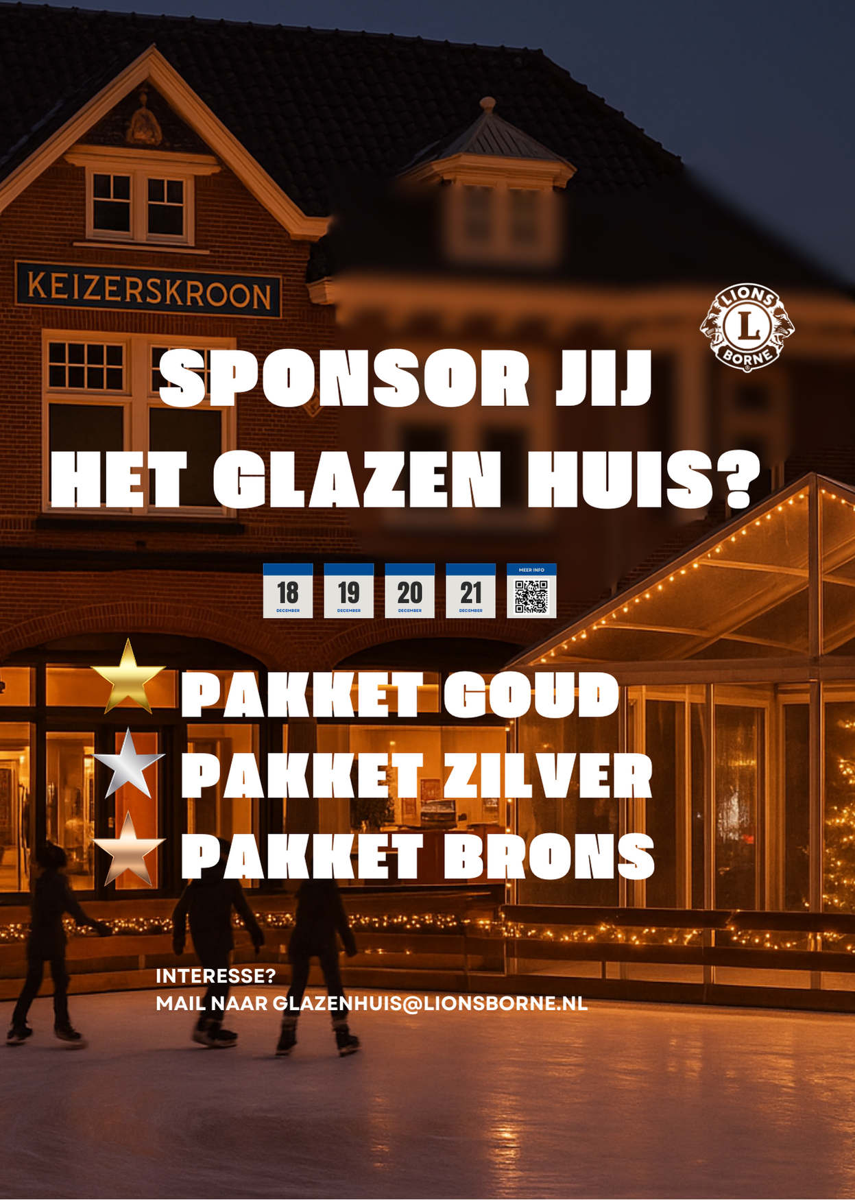 Op 18, 19, 20 en 21 december staat het Glazen Huis bij de IJsbaan in Borne. Vier dagen lang muziek, gezelligheid en samen geld inzamelen voor lokale goede doelen. En jij kunt daarvan deel uitmaken! Als sponsor van het Glazen Huis zet je niet alleen je bedrijf in de spotlight, maar draag je ook bij aan een mooier Borne. Kies het pakket dat bij je past: